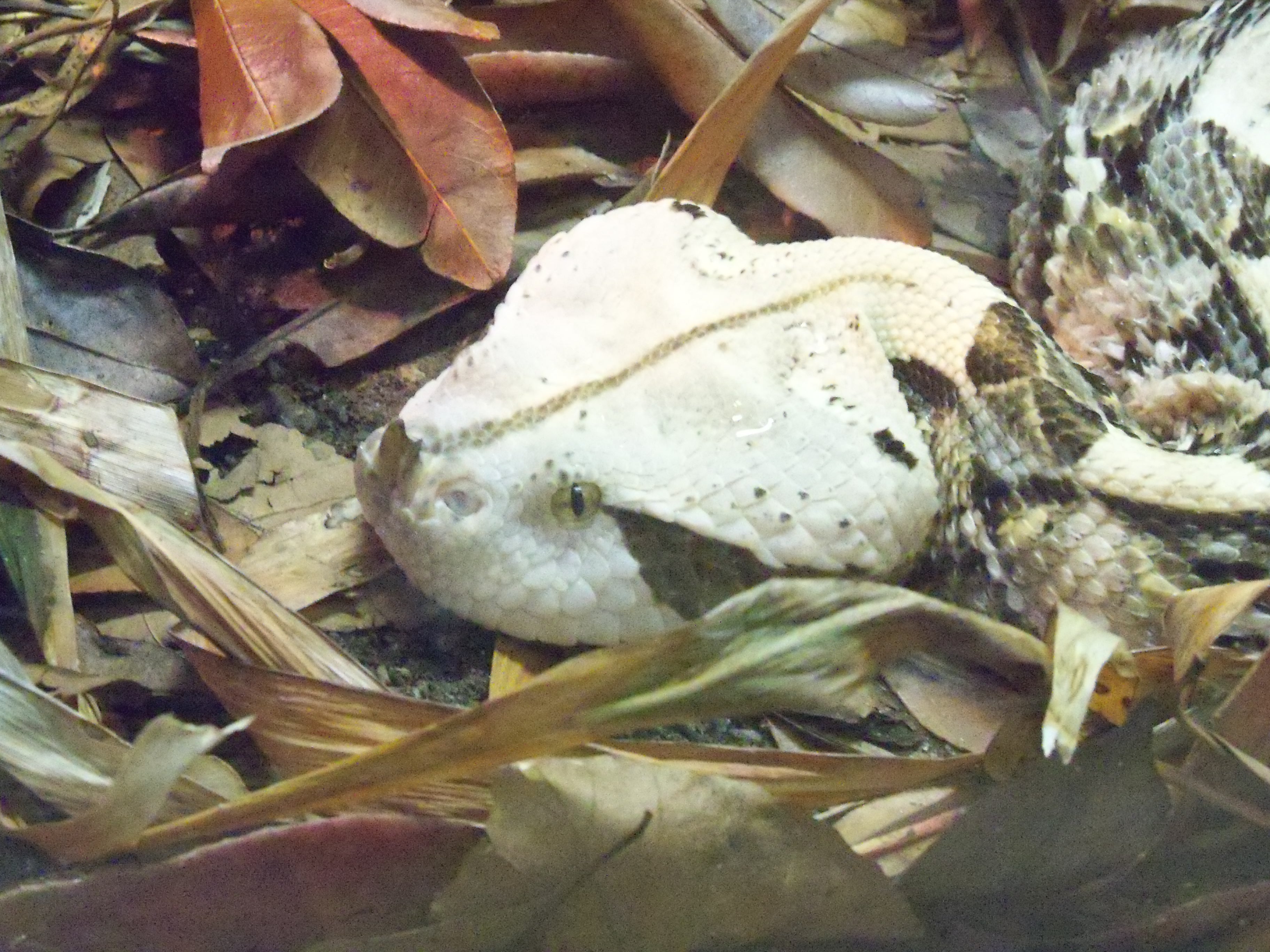I continue to be weirdly obsessed with the Gaboon viper. I’m not sure why, although I think it’s partly the short, broad body, so different than any other snake I’m aware of. I also like the dramatic contrast in their markings and the pale green color that the eyes appear to be, at least on this particular specimen.