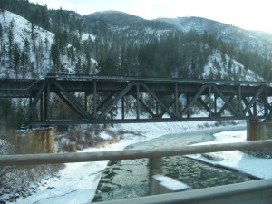 Back on the road, I challenged myself by trying to take photos, through the mud- and snow-spattered window of a moving vehicle, of railroad bridges