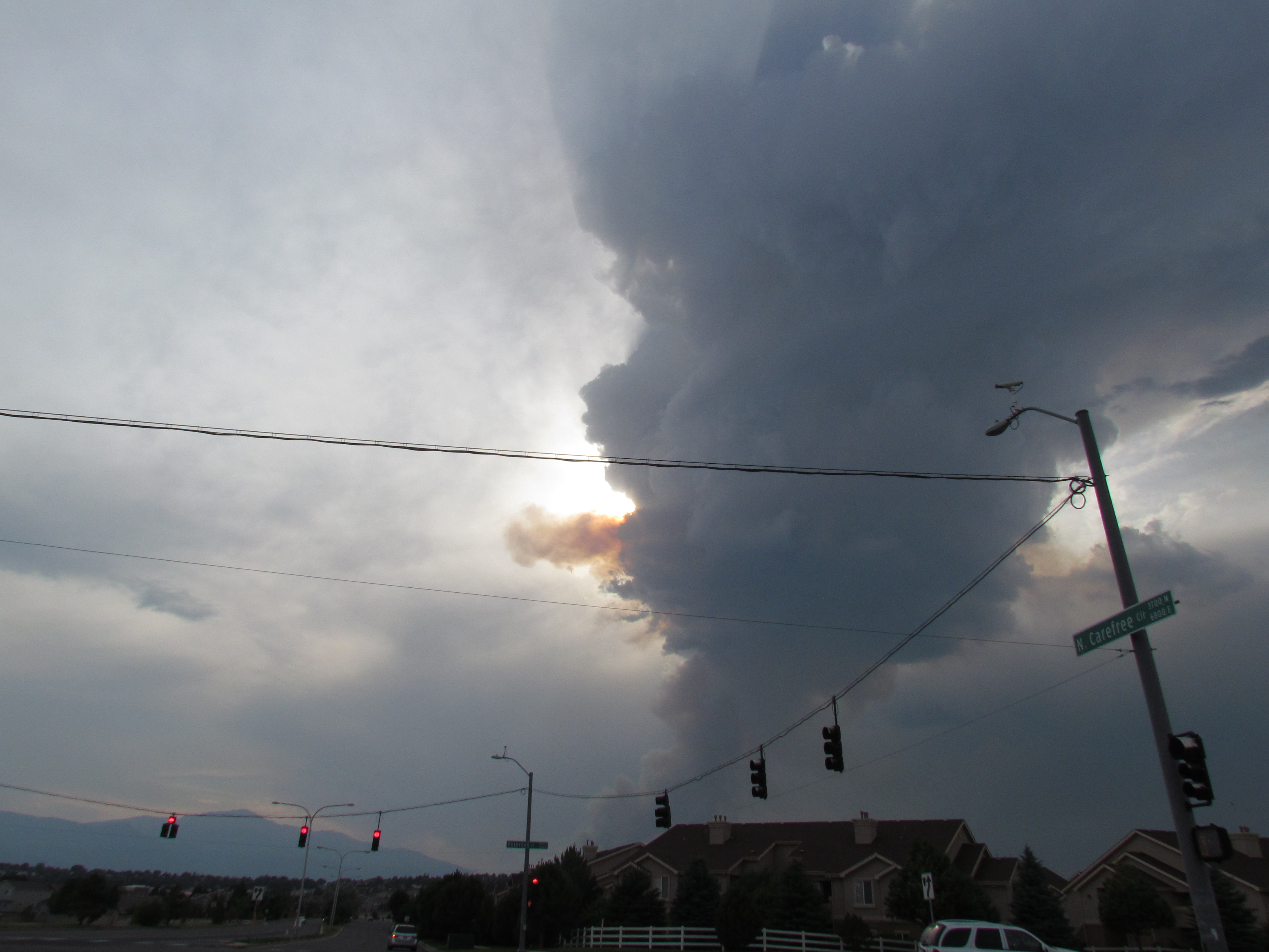 For those familiar with Colorado Springs, the latest news is that Kissing Camels Estates is under mandatory evacuation orders, and Holland Park is on voluntary status. The Garden of the Gods has been closed for several days. Queen’s Canyon above Glen Eyrie has burned, and last I heard, there was still no word on the buildings there. Cedar Heights, Mountain Shadows, Rockrimmon, Peregrine, Mount Saint Francis, Pinon Valley, and the southern housing on the Air Force Academy have all been evacuated. Basically, everything west of I-25 from Fillmore north to the Academy is closed. On the south side, the fire has been contained at Highway 24, with firefighters lining the road to put out sparks and embers flying across the highway.