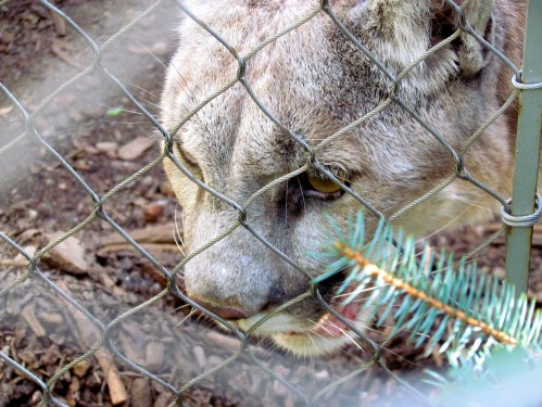Also watching the lions were a man and a young woman, presumably his daughter, who had cerebral palsy. I stuck up a conversation with them, and the man — who, it turns out, has volunteered with the mountain lions at the zoo — told me one of them always stalks his daughter. It’s only one, always the same female, and he thinks it’s because of the cerebral palsy. This is particularly interesting, he said, because the lion in question (whom I believe is the one pictured above; I can’t really tell them apart, and he said it took him awhile to differentiate them too) is going blind. She’s not old; in fact all the lions on exhibit are litter-mates, but something’s wrong with her eyes.