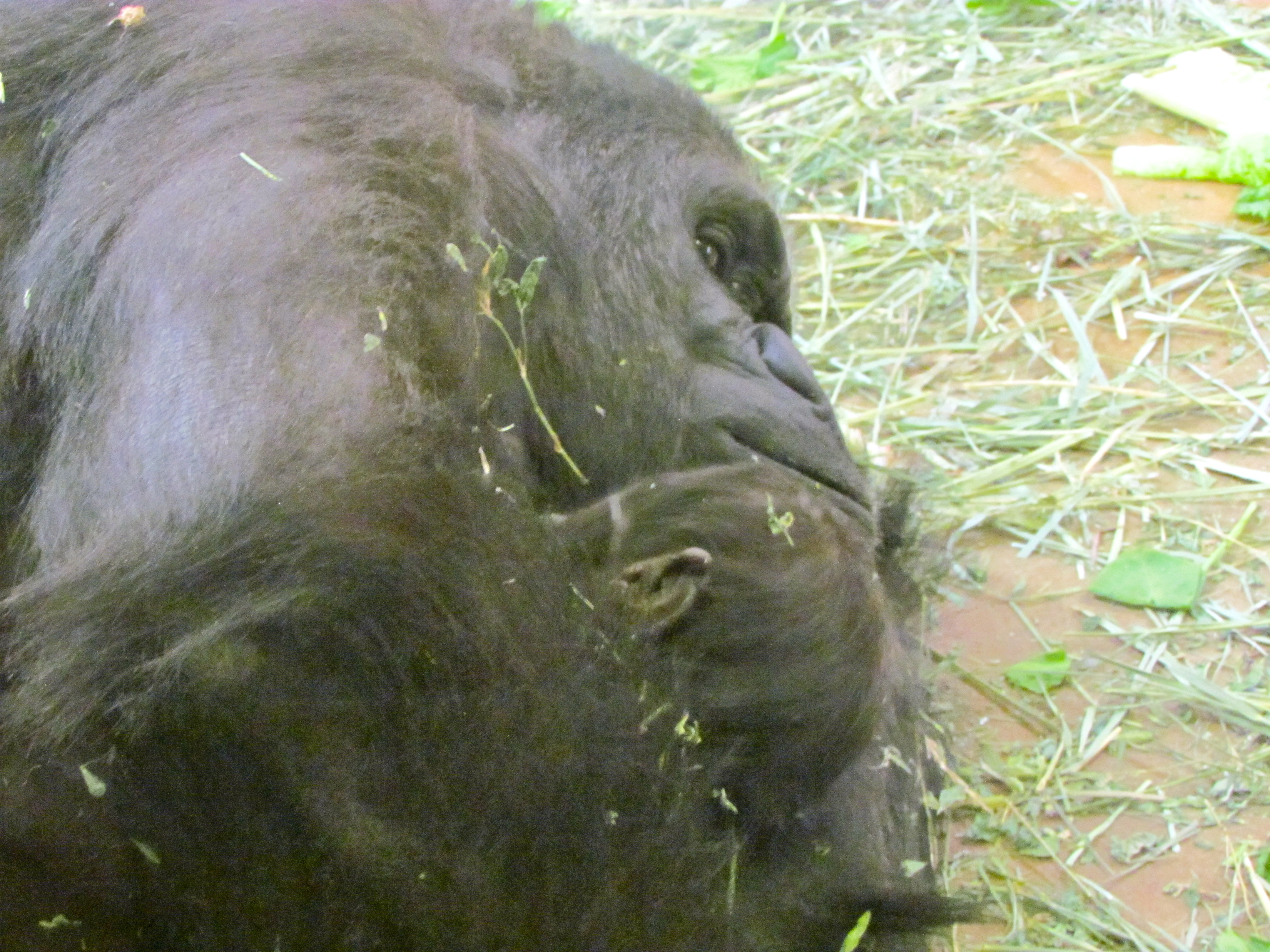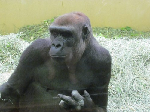 When I arrived in the primate house, Asha was right by the window, nursing the baby. The way she cradled him/her was precious. The baby looked up a couple of times, right at me, but because of the smudgy glass and my smudgy lens (which is getting cleaned tonight; I bought solution this afternoon) I didn’t get any good photos. I loved the baby’s little ear; it looks so human. The adult gorillas have them too, but I guess I’d never noticed before.*