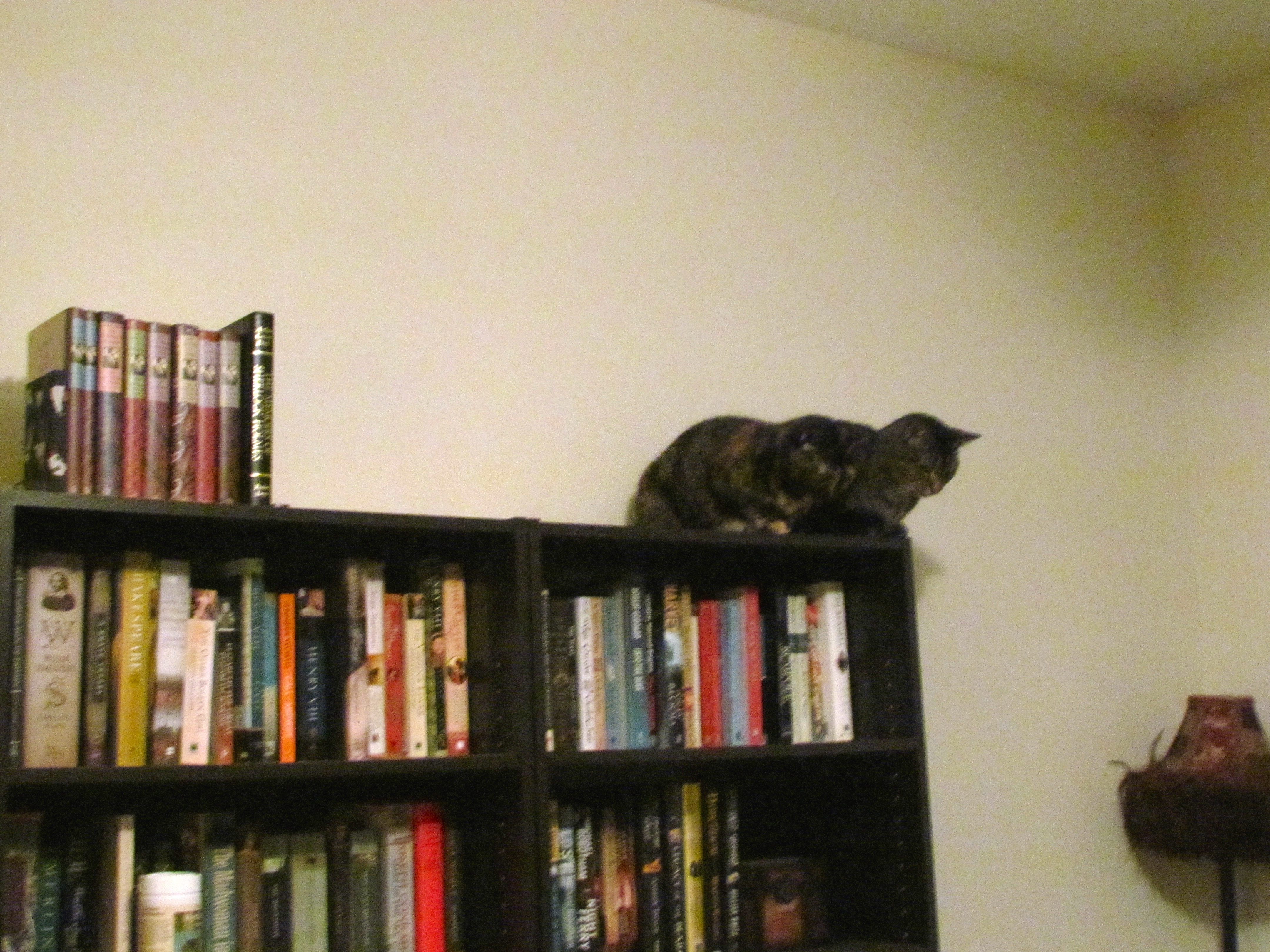 They’re gargoyles on the bookshelf! But Zuli is a pill; whenever she’s doing something cute and I get the camera out, she runs away. This is why I do not have any bookshelf closeups or pictures of her foray into a fabric shopping bag tonight.