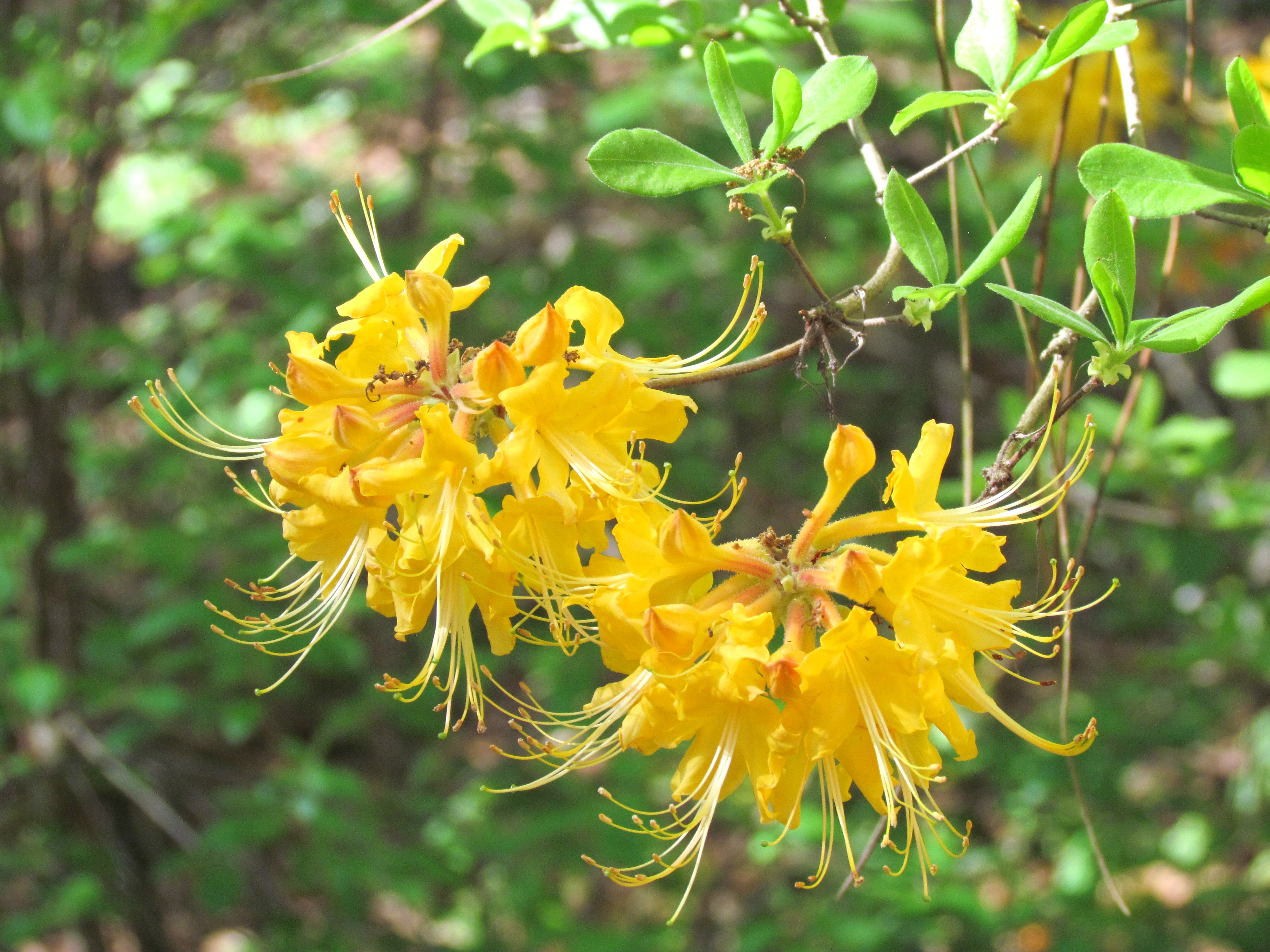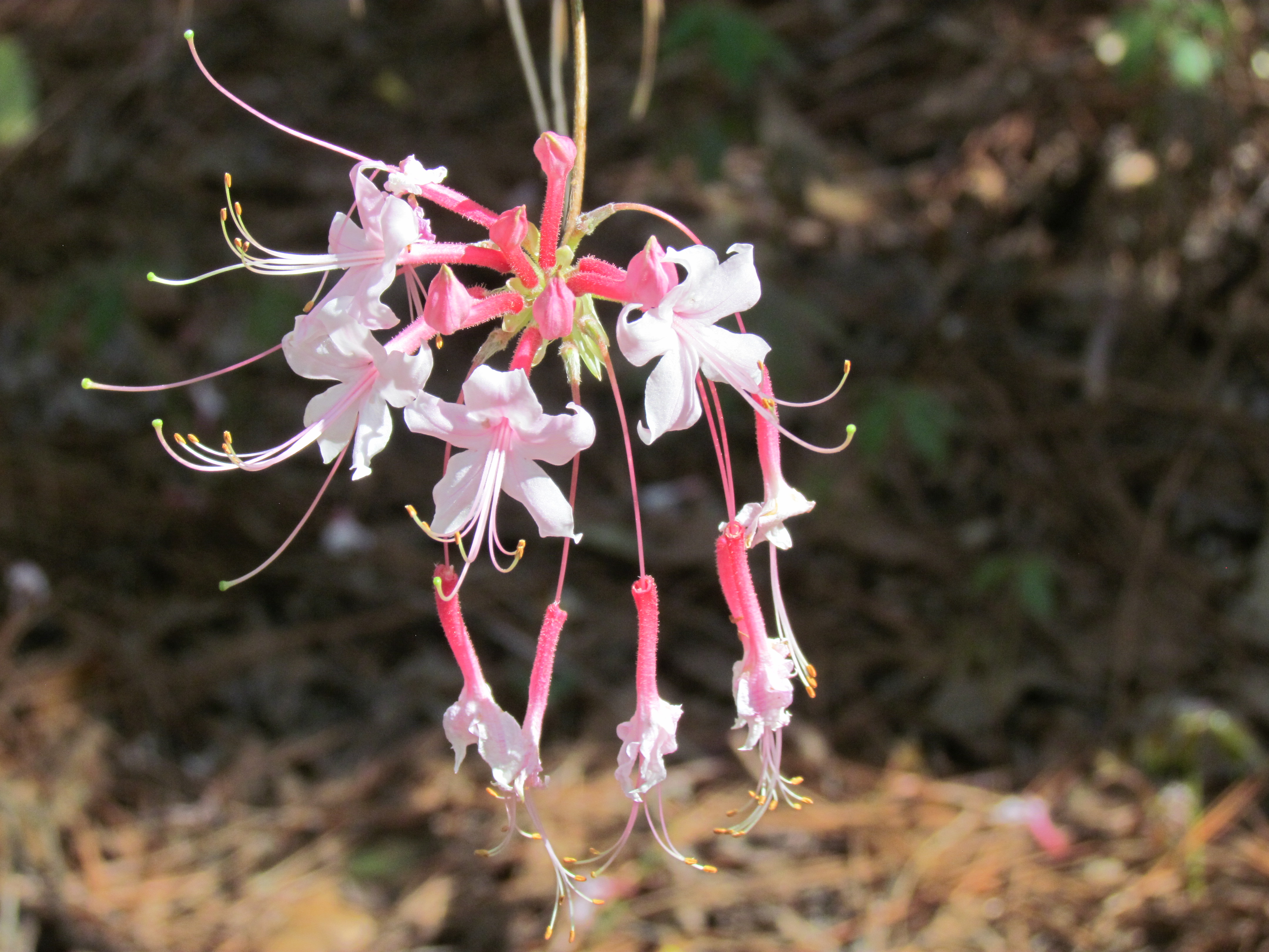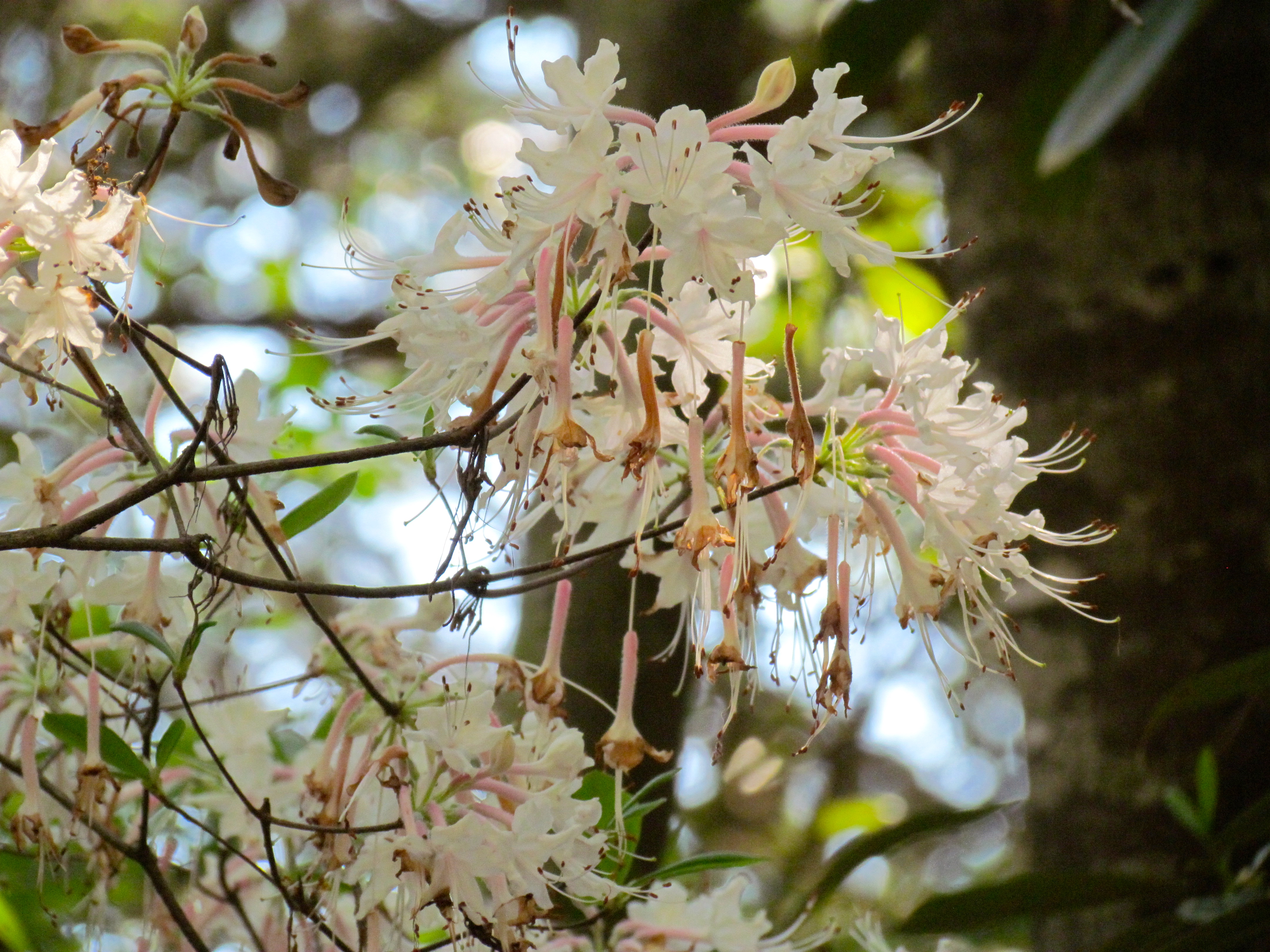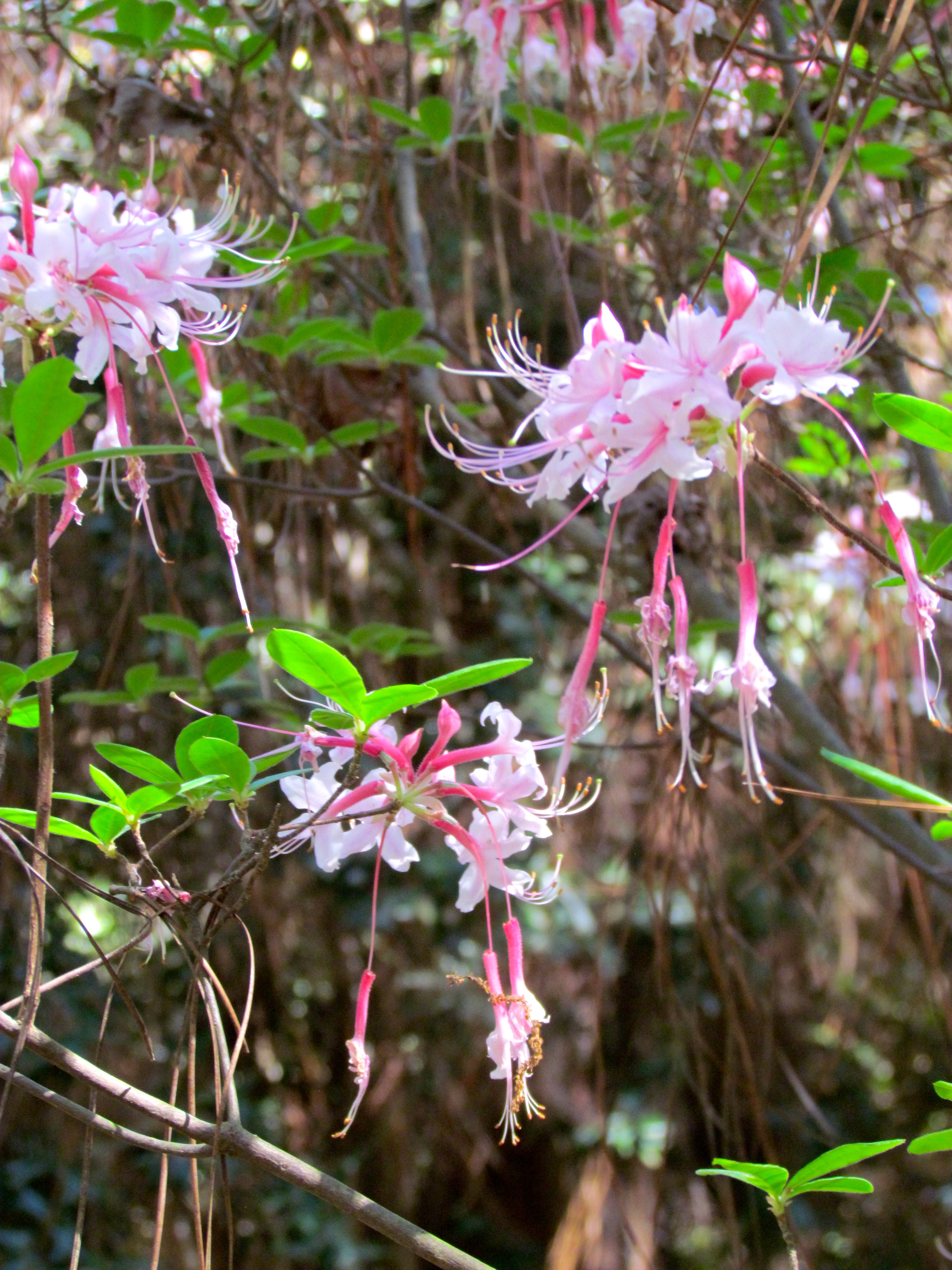 There’s a stand of longleaf pine, which need fire to reproduce. Garden staff must have held a controlled burn recently; the smell of woodsmoke lingers in the air, but a few green shoots are poking out of the ground. The swamp azalea were brilliant across the burned area.