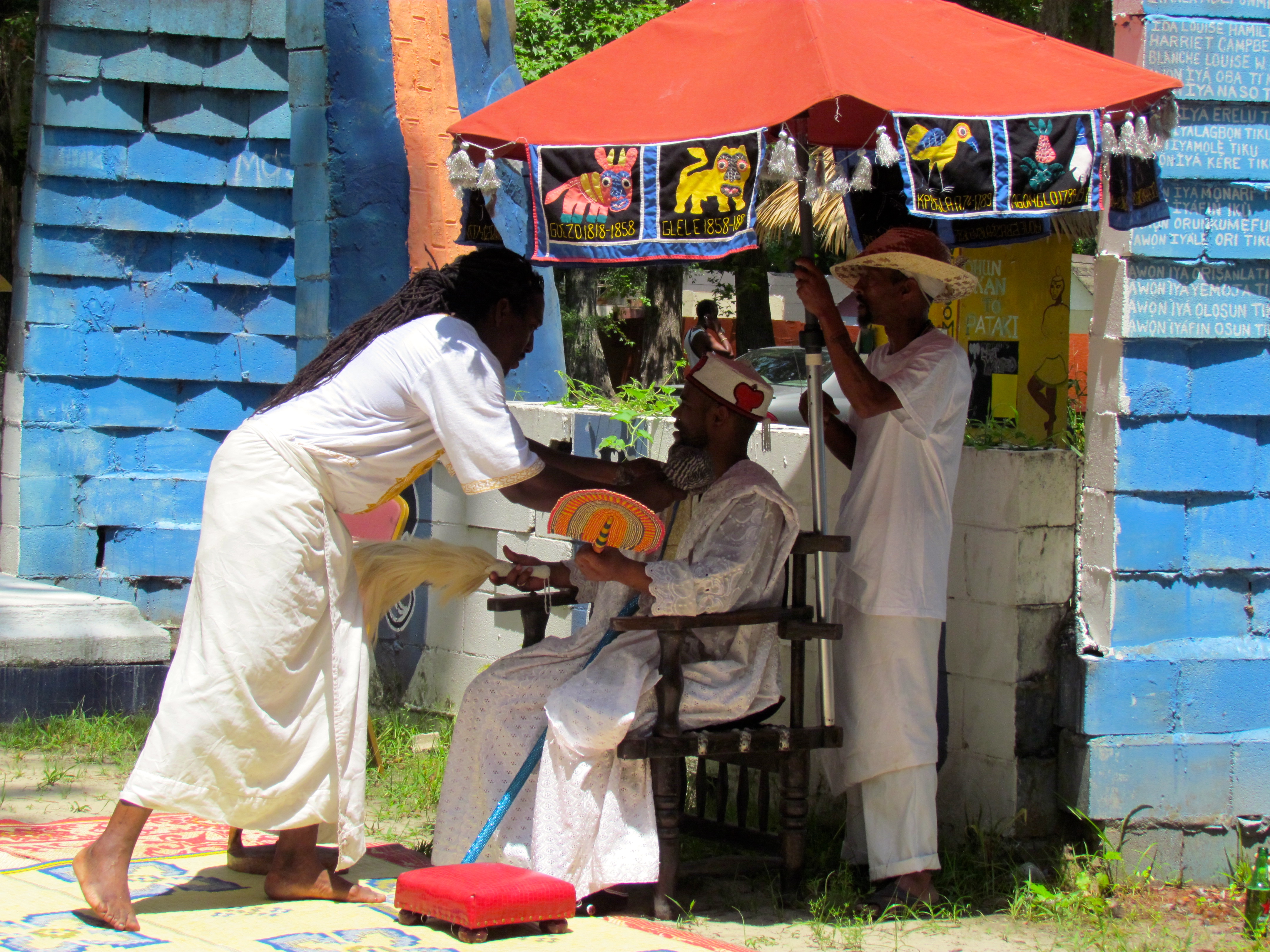 When you arrive in the parking lot after driving down a rutted little road, you see a sign announcing that you are leaving the United States and entering the sovereign Yoruba kingdom. The village has its own king, who was appointed by the Yoruba king in Benin. His father, the village founder, studied Santeria in Cuba, and residents practice African vodoun (in a much more authentic form than I realized, it turned out; I had been expecting something more akin to New Orleans’ tourist-friendly French Quarter voodoo). Their veneration of orishas and ancestors governs every aspect of their lives.