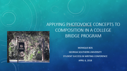 - Applying Photovoice Concepts to Composition in a College Bridge Program (PowerPoint, presented at Student Success in Writing Conference, April 2018)